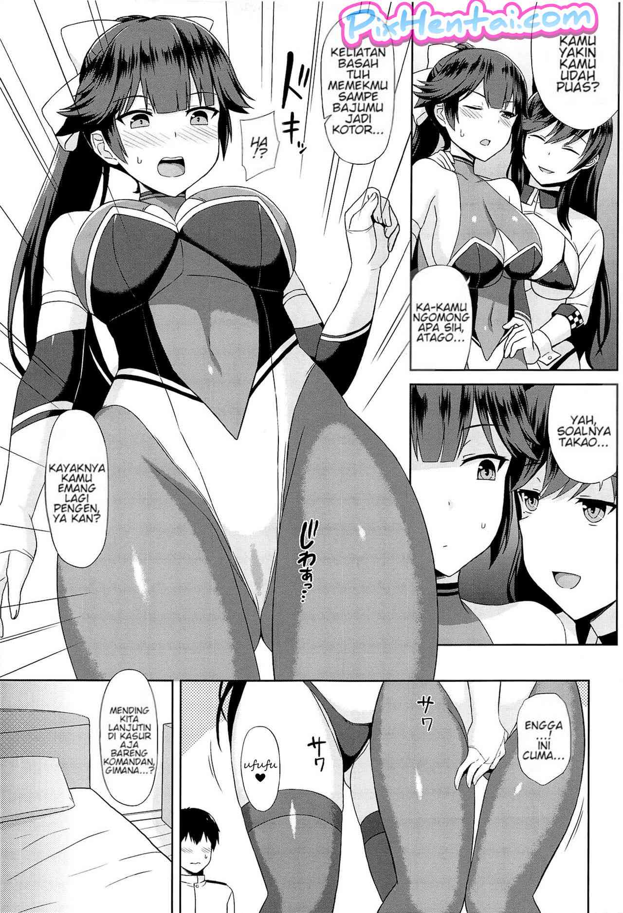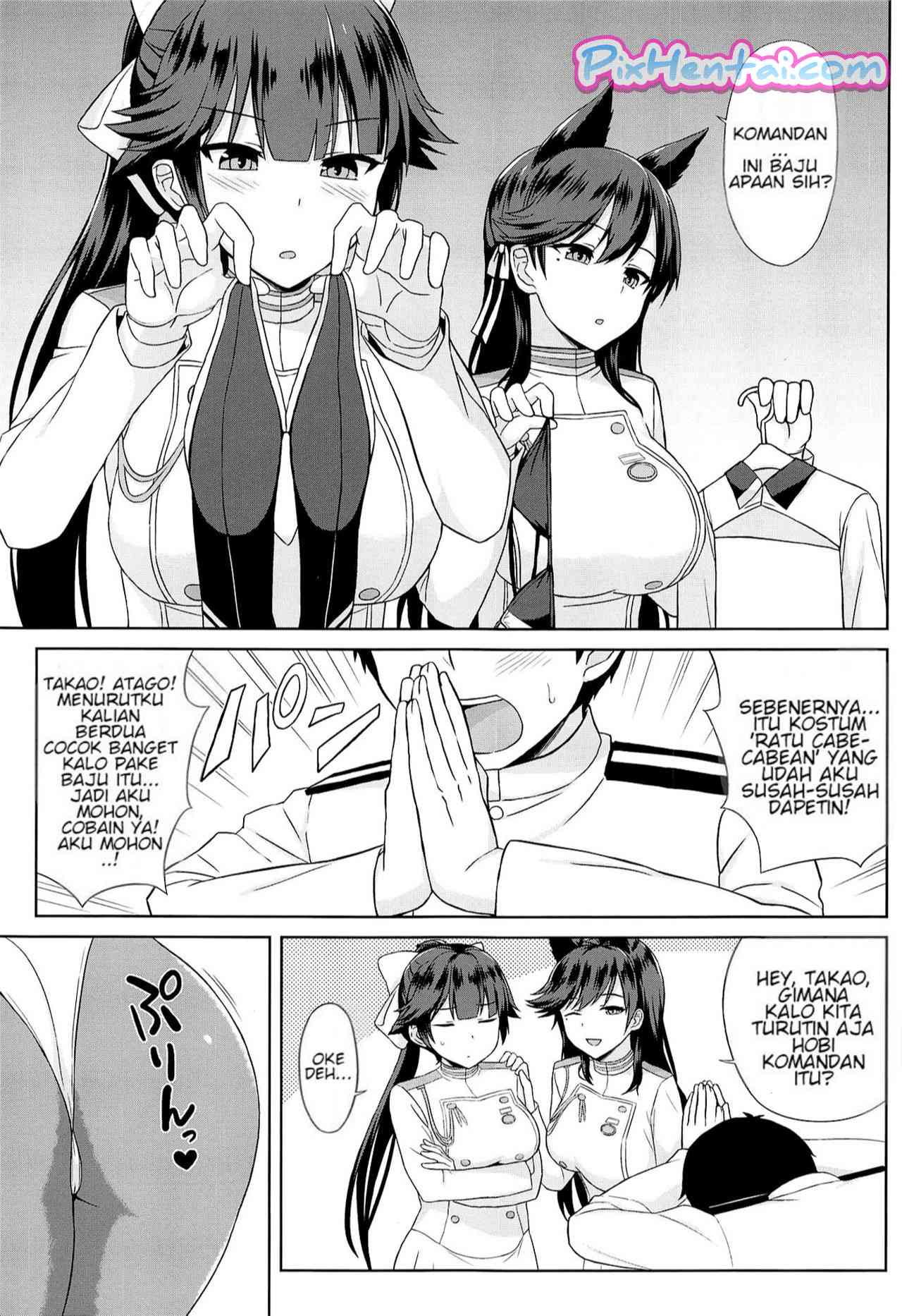 Takao dan Atago menemukan baju aneh milik komandan. Ternyata itu adalah kostum ratu cabe-cabean. Komandan sangat ingin baju itu dipakai oleh Takao dan Atago. Namun karena kostumnya terlalu ketat dan sexy komandan jadi ingin ngentot mereka.