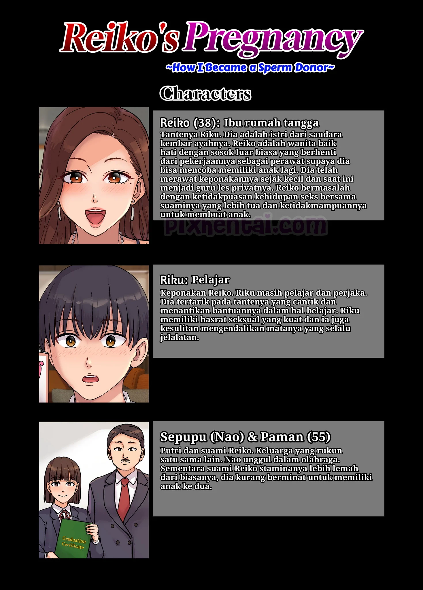 Riku mempunyai tante yang baik, cantik dan juga semok bernama Reiko. Karena ingin memiliki bayi lagi, tante Reiko keluar dari pekerjaannya sebagai perawat dan fokus ngesex dengan suaminya. Namun sang suami yang sudah tua ternyata tak mampu lagi menghasilkan sperma yang melimpah dan berkualitas. Akibatnya, walau sudah digenjot setiap malam oleh suaminya, tante Reiko tak kunjung juga hamil. Di saat seperti itulah, tante Reiko kepikiran untuk menjadikan keponakannya sendiri yaitu Riku sebagai pendonor sperma untuk dirinya.