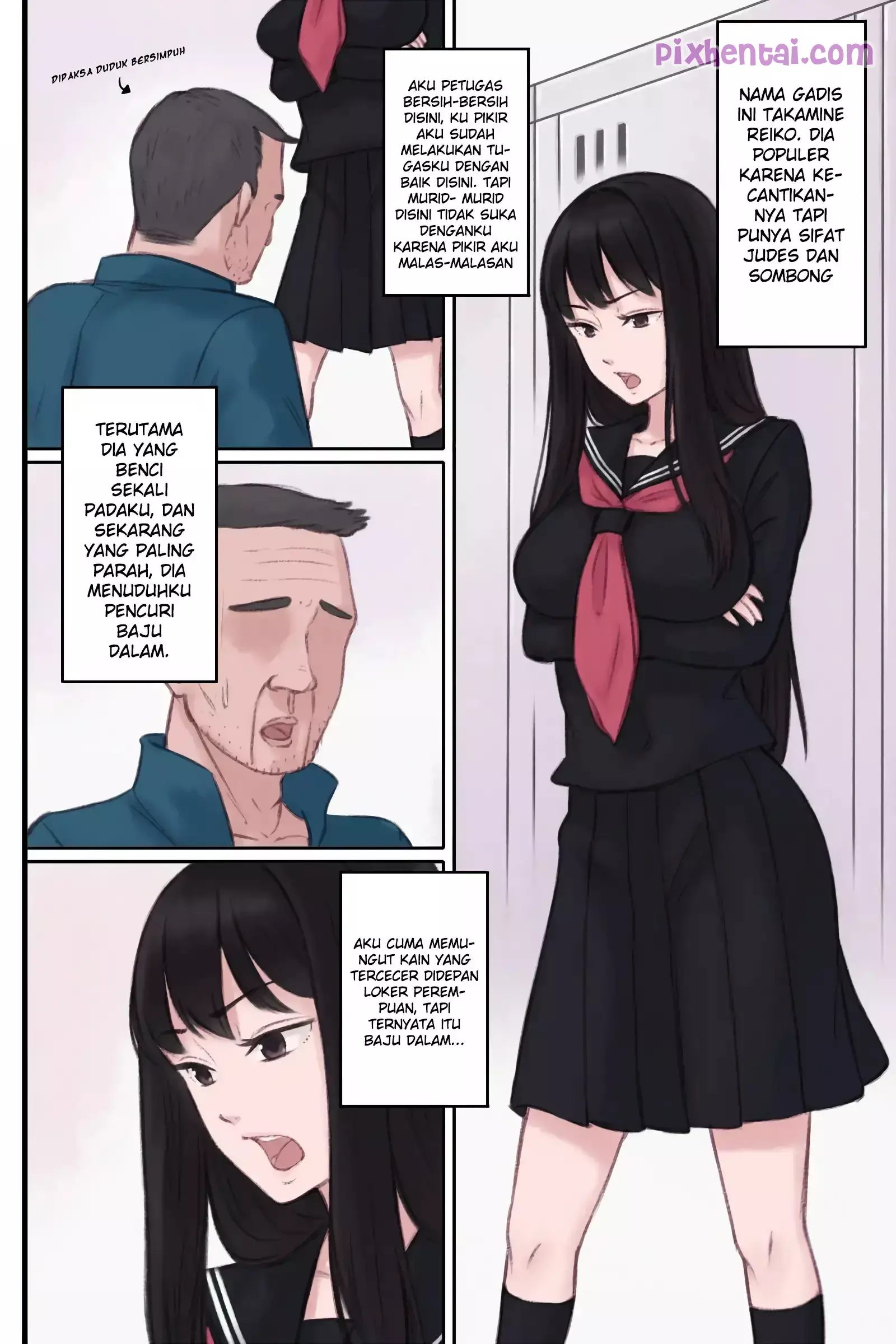 Seorang petugas kebersihan sekolah, meniduri seorang siswi perawan setelah dituduh mencuri pakaian dalam. Semua berawal ketika petugas kebersihan itu memungut kain yang tercecer di ruang ganti perempuan, tetapi ternyata kain itu adalah pakaian dalam wanita. Perbuatannya tersebut lantas diketahui oleh seorang siswi yang populer dan cantik namun juga judes bernama Takamine Reiko. Karena terus dituduh dan diancam oleh Reiko, petugas kebersihan tersebut pun tak punya pilihan lain.